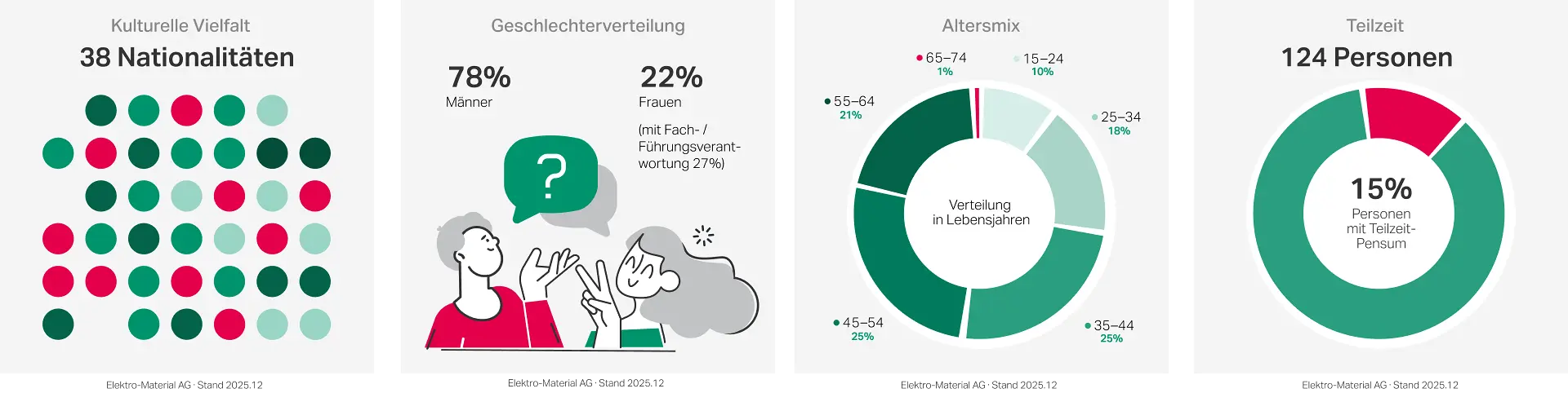 Auch wenn der Männeranteil branchenbedingt aktuell bei 78% liegt, sind bereits 22% unserer Mitarbeitenden Frauen, von denen über ein Viertel Fach- und Führungspositionen innehat – ein klares Zeichen für unser Engagement, Frauen gezielt zu fördern. Darüber hinaus legen wir grossen Wert auf Inklusion. Kolleginnen und Kollegen mit Beeinträchtigung sind fester Bestandteil unseres Teams und tragen wesentlich zu unserem gemeinsamen Erfolg bei.